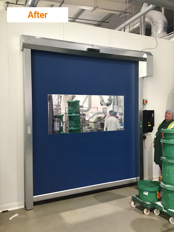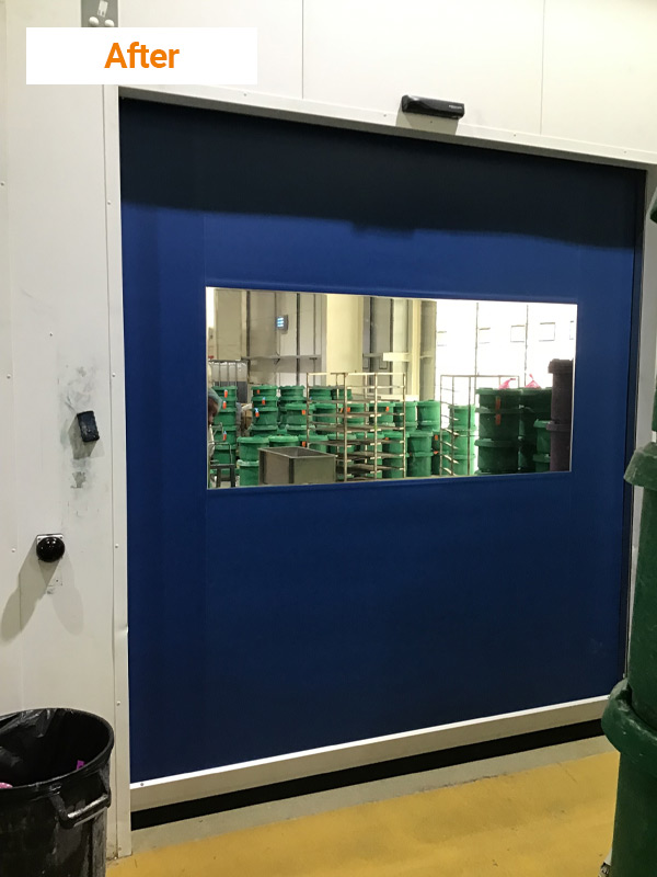 The client wanted to insert a divide and demarcate the production zones. Often our high-speed warehouse doors are used to create zones or work areas, that also act to improve air quality and reduce cross contamination. A SRT ECO (high-speed roll-up fabric door) was recommended using hard wearing transilon fabric due to its perfect blend of cost, design and functionality. They are extremely economical and ideal for indoor use. Their fast opening and closing speeds help to insulate noise, and keep temperature zones constant. They are virtually maintenance-free and capable of up to 150,000 operating cycles per year, making them ideal for this particular client application.